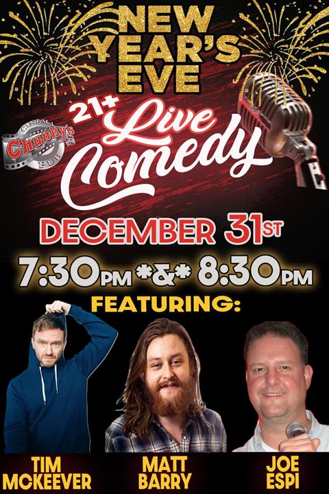 Join us this New Year's Eve for 3 hilarious comedians! End the New Year with some laughs from these 3 "Laugh Out Loud" Comedians!! Tim McKeever, Matt Barry and Joe Espi. DOORS OPEN ONE HOUR BEFORE COMEDY START!